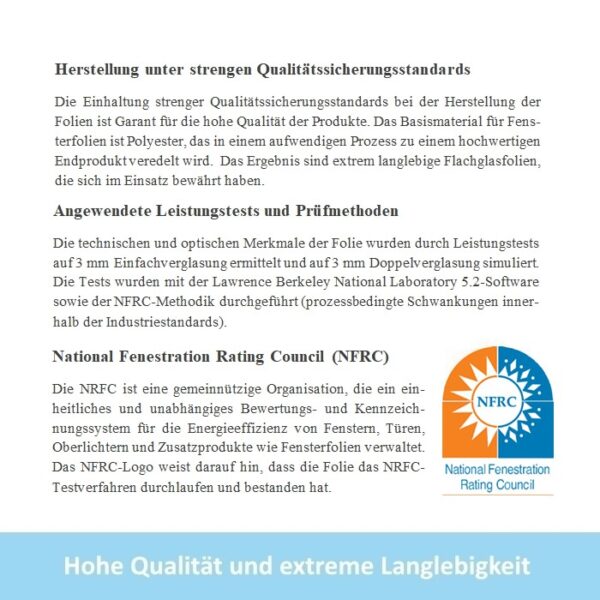 Regardless of the long durability, a manufacturer’s guarantee of 7 years for vertical and 3 years for inclined glass surfaces is granted. The guarantee applies to peeling and yellowing of the high-performance film if the edges of the film are sealed all around with silicone.