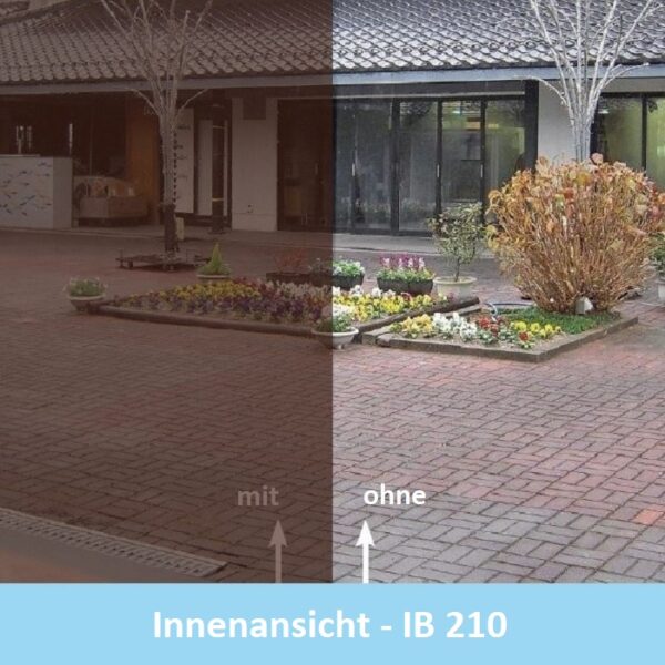 The sun control film IB 210 Bronze mirrored is self-adhesive and is installed to the interior window side. Heat development is permanently reduced by strong 81%. This noticeably improves the indoor climate. Existing energy and electricity costs for operating air conditioning systems can be reduced in this way. The energy efficiency of the installed window glazing is sustainably increased.
