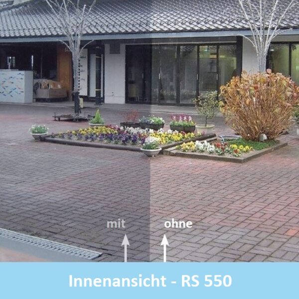 The sun control film RS 550 Silver light is self-adhesive and is installed on the interior window side. With a light silver grey finish it ensures a very good daylight permeability of the coated glass surface. The natural reflection of the window pane and thus the external appearance of the building are hardly changed: when viewed from the outside in daylight, only a slight reflection of the sun control film is visible. It is therefore particularly suitable for projects where light-flooded rooms and pleasant solar control are important.