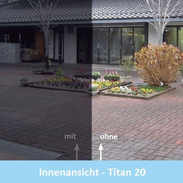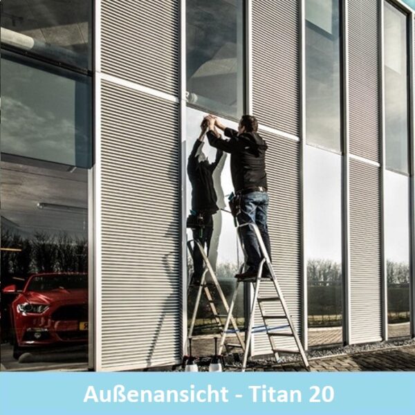 The sun control film Titan 20 mirrored exterior is self-adhesive and is installed on the exterior window side. It has a transparent color in dark titanium. It is therefore particularly suitable for window panes that face south. The brightness on this side of the building ensures that the loss of light caused by the sun control film can be compensated very well. This ensures a sufficiently high level of daylight permeability.